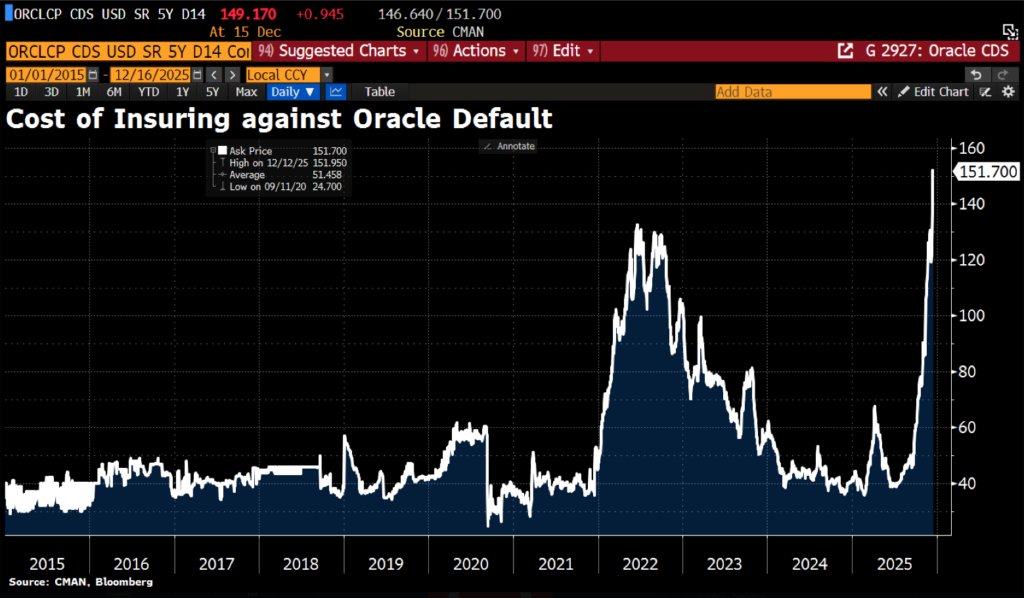 Eu sempre olho para os Credit Default Swaps (CDS) para medir o risco real de uma empresa. Recentemente, os spreads dos CDS da Oracle dispararam para mais de 120 pontos base. Isto significa que o custo para segurar a dívida da Oracle contra um incumprimento duplicou em poucos meses.