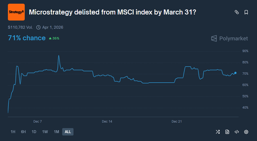 O maior perigo para a Strategy Inc. (MSTR) em 2026 não é apenas a volatilidade do Bitcoin, mas a sua permanência nos grandes índices. Atualmente, mercados de apostas estimam que existe uma probabilidade superior a 70% de a empresa ser excluída do Nasdaq-100 ou do MSCI USA nas próximas revisões. Esta elevada probabilidade deve-se à natureza da empresa ter transitado de “software” para “veículo de investimento”, o que viola os critérios técnicos de classificação de setores de muitos índices passivos.
